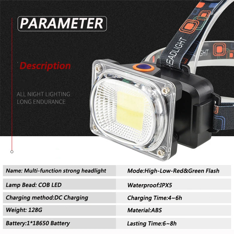 remarkable Portable COB LED Headlamp DC charging Outdoor camping Fishing headlights Work Maintenance Searchlig